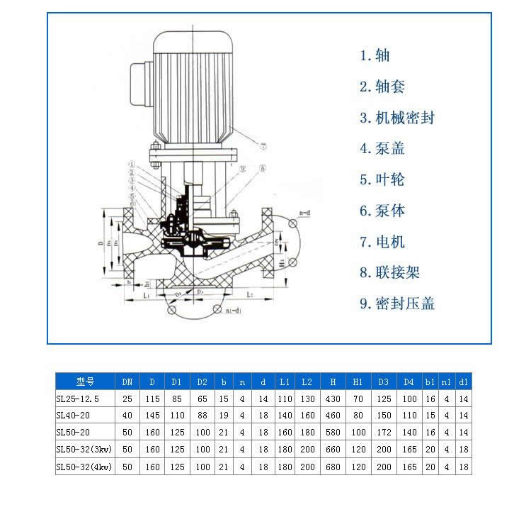 1 轴 2 轴套 3 机械密封 4 泵盖 5 叶轮 6 泵体 7 电机 8 联接架 9 密封压盖