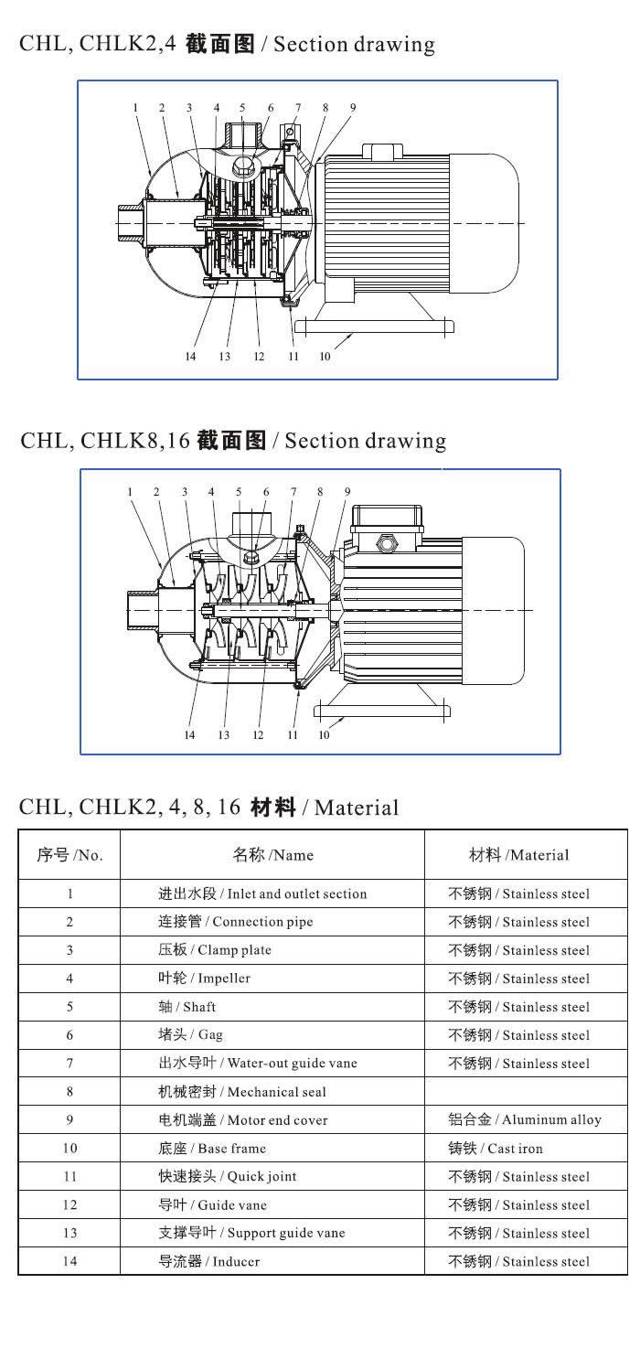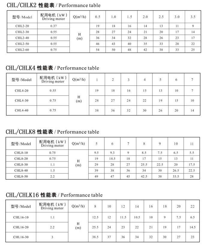 CHL,CHLK和CHLF(T)轻型卧式多级离心泵采用了免修机械密封。泵的过流部件均采用不锈钢材料(304或316)制成,具有低噪音,耐轻腐蚀,外形美观、体积小、重量轻、使用寿命长等特点。