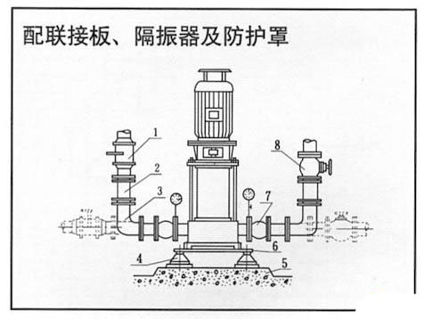 1.进口阀门 2.直管 3.弯管 4.隔振垫 5.联接板 6.基础 7.挠性接头 8.出口阀门