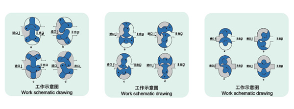 转子泵又称胶体泵,三叶泵,鞋底泵等。依靠两同步反向转动的转子(齿数为2-4)在旋转过程中于进口处产生吸力(真空度),从而吸入所要输送的物料。两转子将转子室分隔成几个小空间,并按a→b→c→d的次序运转。运转至位置a时,只有I室中充满介质; 到位置b时,B室中封闭了部分介质; 到位置c时,A室中也封闭了介质; 到位置d时,A、B室与Ⅱ室相通,介质即被输送至出料口。如此循环往复,介质(物料)即被源源不断地输送出。
