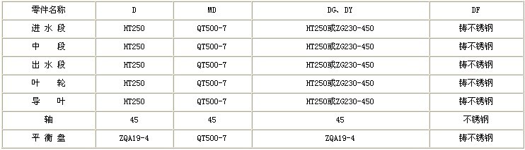 1.定子部分:主要由进水段、中段、出水段和导叶等组成,用穿杠将各段拉紧,构成工作室。D型泵进口为水平方向,出口垂直向上;DG型泵进、出口均垂直向上;MD、 DF、DY型泵出口垂直向上,进口一般为水平方向,根据需要也可生产进出口垂直向上方向。