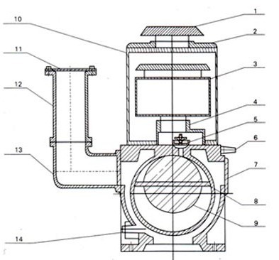 五、X系列旋片式真空泵的原理及结构图: X系列旋片式真空泵主要由泵体(7)、转子(9)和旋片(8)等零件所组成(见原理示意图)。在泵体腔内偏心地装着转子,转子槽中装两块旋片,由于弹簧弹力作用及转子旋转所产生的离心力旋片紧巾腔壁,泵体中的进、排气只被转子和旋片分隔成两个部分,转子在腔内旋转,周期性地将进气口部分容积逐渐扩大而吸入气体,同时逐渐压缩排气部分容积,将吸入气体压缩从排气阀(5)排出,因而达到抽气目的。 X型旋片式真空泵的结构图: |